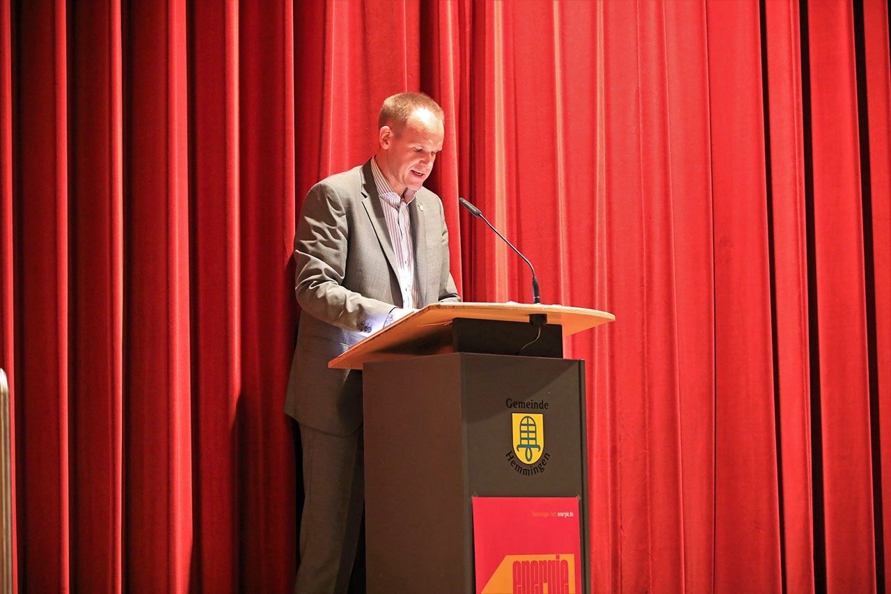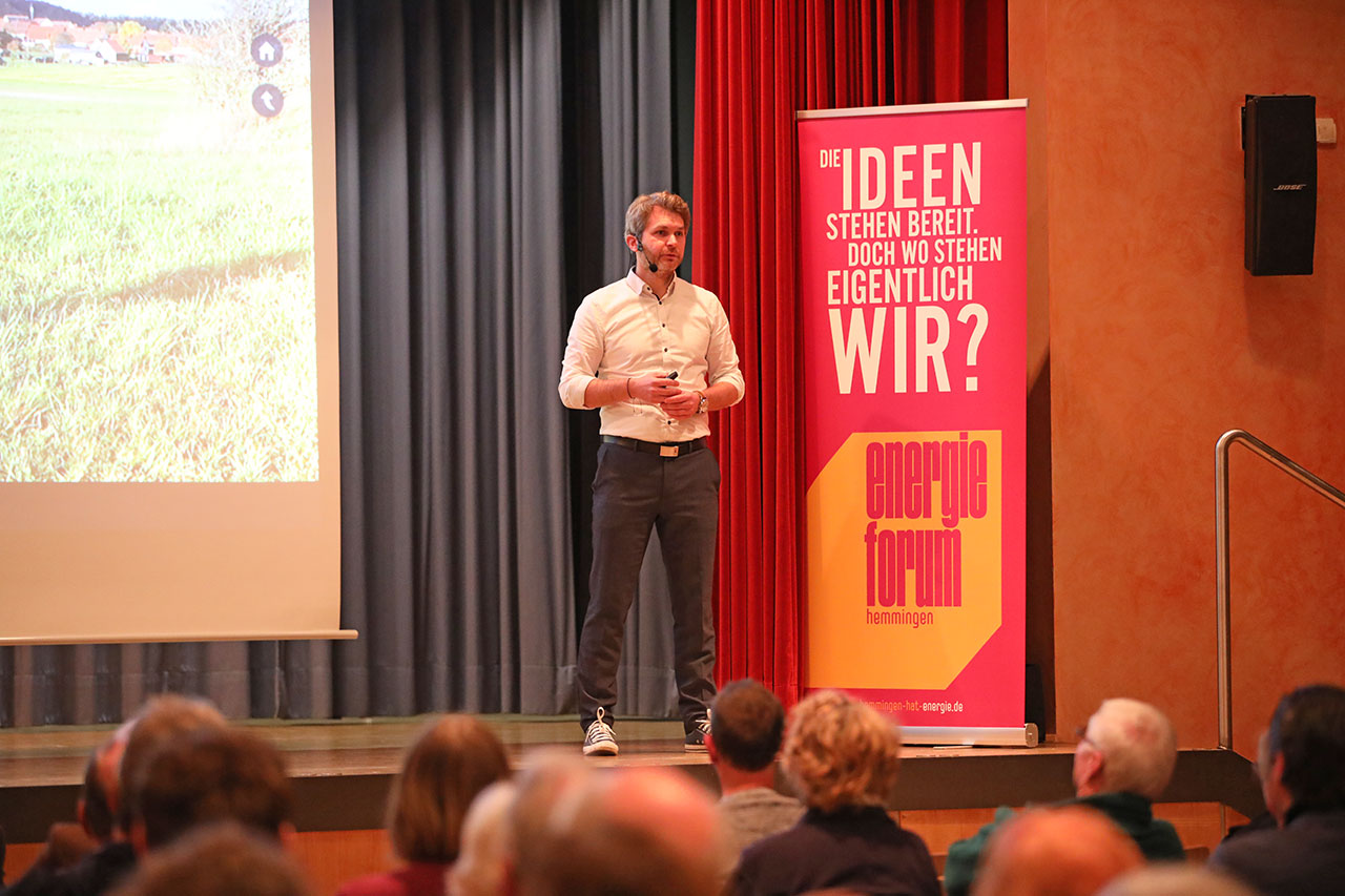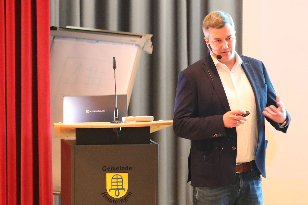 Andreas Huber ist seit 10 Jahren professioneller Vortragsredner und Keynote Speaker für Nachhaltigkeit und zukunftsfähige Entwicklungen. Mit seinem Vortrag rüttelt er unsere Narrative auf und ermutigt zu neuen Denkweisen. So zündete er sich gleich zu Beginn seines Vortrages zum Schein eine Zigarette an – und erntete entsetzte Blicke. Noch vor 16 Jahren hätten viele keinen Anstoß daran genommen. Er setzt damit auf die Anwendung anschaulicher Metaphern und Beispielen aus dem Alltag damit Menschen ihre Standpunkte hinterfragen und Mut bekommen sich weiterzuentwickeln. Denn: An Standpunkten festzuhalten, bedeutet Stillstand. Sein Leitfaden war auch gleichzeitig sein Schlussappell – „auch kleine Schritte schaffen große Veränderungen“ - er bat damit die Saalgäste den Mut zur Weiterentwicklung nie zu verlieren. Denn dass man in Hemmingen schon ganz viele kleine Schritte gegangen ist, entlockte ihm auch das Geständnis, ein wenig neidisch zu sein auf das, was die Gemeinde Hemmingen im Hinblick auf Erneuerbare Energien schon erreicht hat. Unter dem großen Applaus der Gäste verabschiedete er sich und räumte seinen Platz auf der Bühne für den nächsten Gastredner.